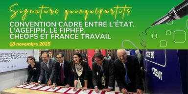 Durant le salon des maires qui se tient à Paris du 18 au 20 novembre, l'Etat, l'Agefiph, le Fiphfp, France Travail et Cheops ont signé une nouvelle convention quinquépartite pour 3 ans (2026-2028)